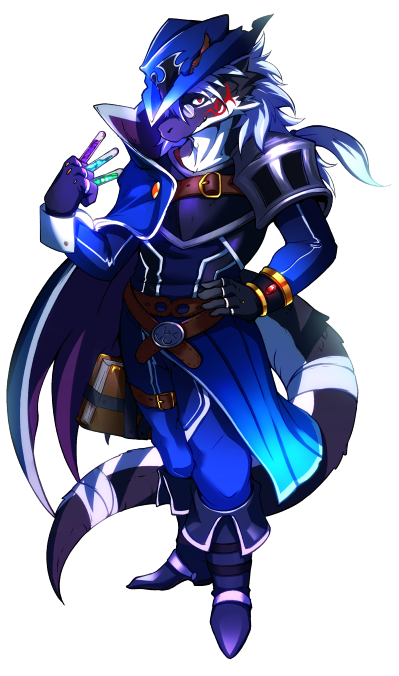 鎧の隙間から白毛が飛び出ているのが特徴的なリルドラケンの神官。夕暮れ色の瞳孔に眼鏡をかけ身の丈程の盾を持つ。