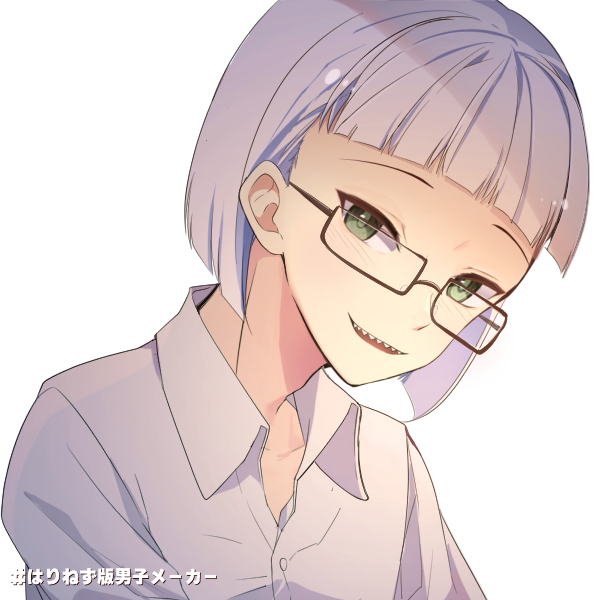 白髪、緑眼、ギザ歯、眼鏡、