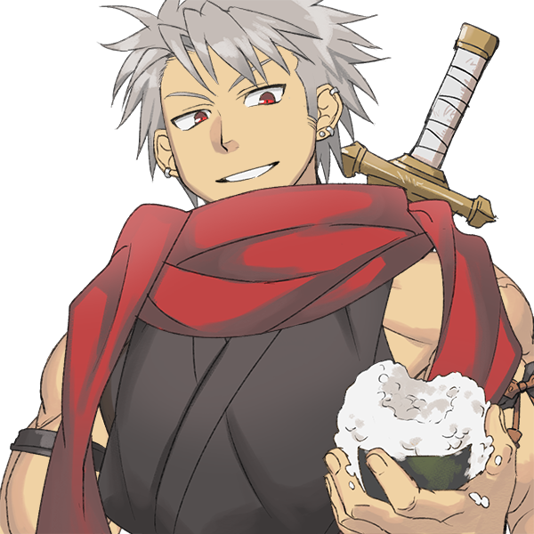 銀の髪と赤い目という、目を引く見た目をした大男。不敵な笑みを浮かべ、極東風の衣装を装備の上から着ている。