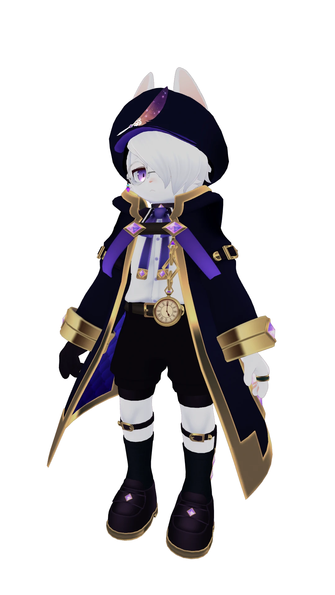 白毛の立ち耳うさぎで、髪の毛で片目隠れしている。右目は紫、左目は金色のオッドアイ。本の読みすぎでちょっと近視。