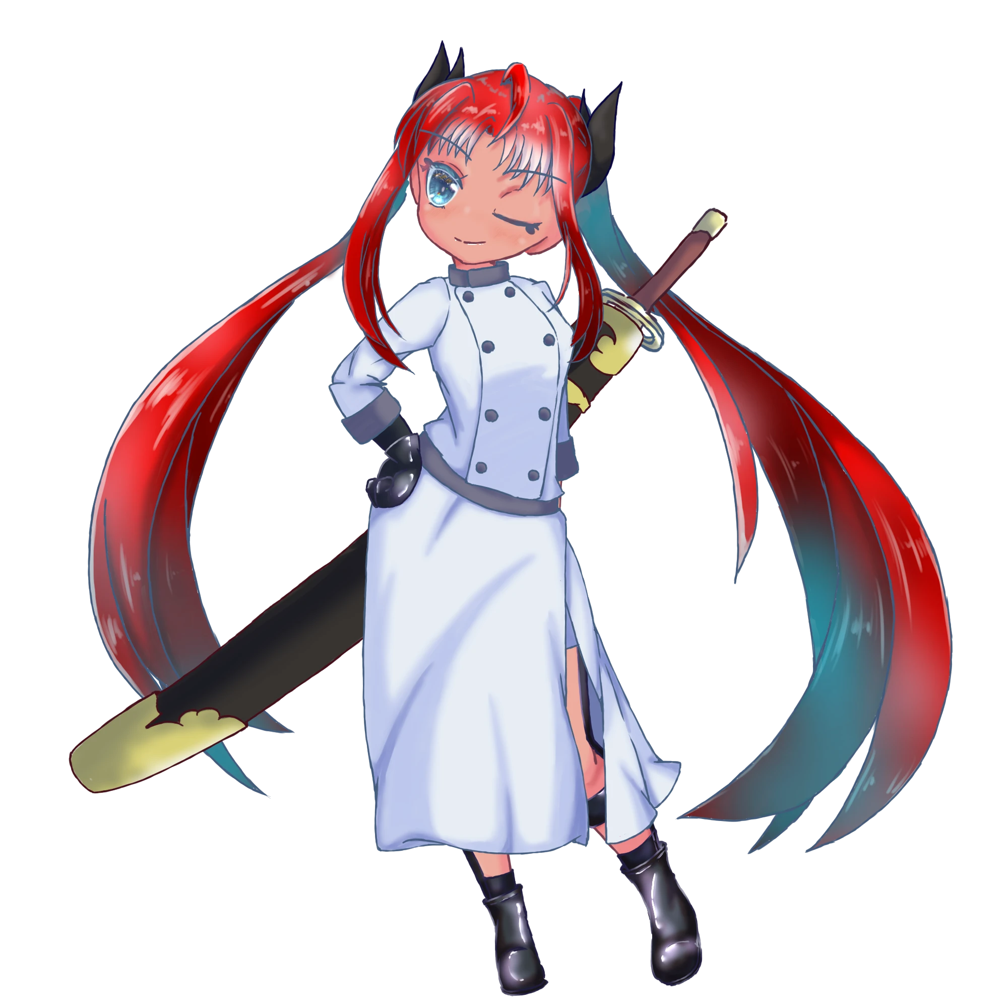 鮮やかな赤髪をツインテールに結び、黒いリボンが特徴的。