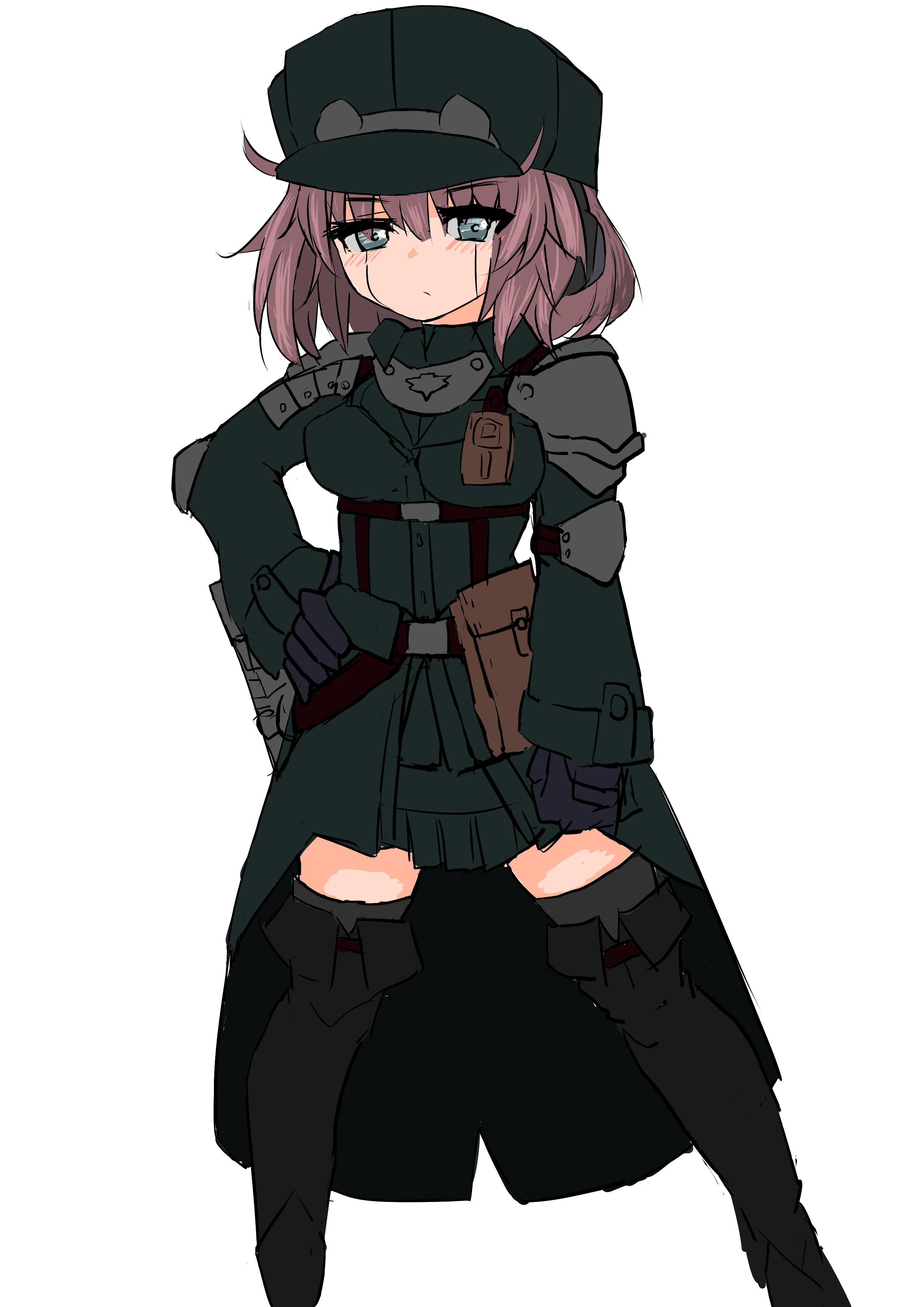 トレンチコートのような服に胸元にコ゚の字の鉄プレートの飾りをつけている(のちのち立ち絵予定