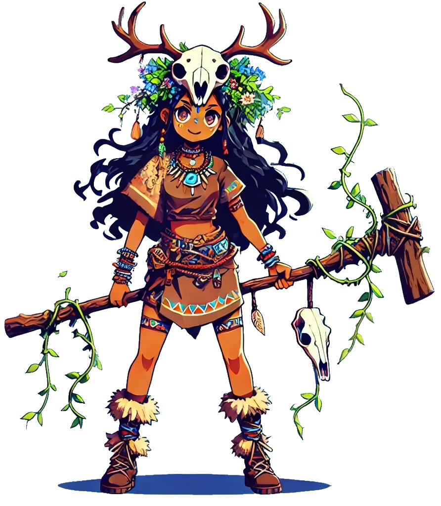 アーディティヤ・アリヤマンは、彼女の部族「アシャル族」の歴史において、最も優れた才能を持つシャーマンと称されていました。幼少期から霊的な力が突出しており、部族の精霊たちと自然に対話できる特別な能力を持っていたのです。その才能を見込んだ高名なシャーマン、セドリック・オーラティスに師事し、厳しい修行を経て彼の一番弟子となりました。そして、精霊の力と知恵を象徴する重要なアイテムである「鹿の頭蓋骨*①」を授けられたのです。