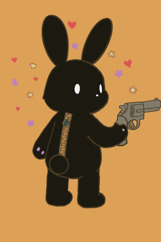直立した二足歩行のぬいぐるみよりの黒いウサギ。