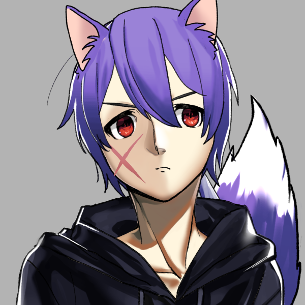 紫色の髪をポニーテールにしている。狼の耳と尻尾が生えている。瞳の色は赤。頬に大きな傷跡がある。