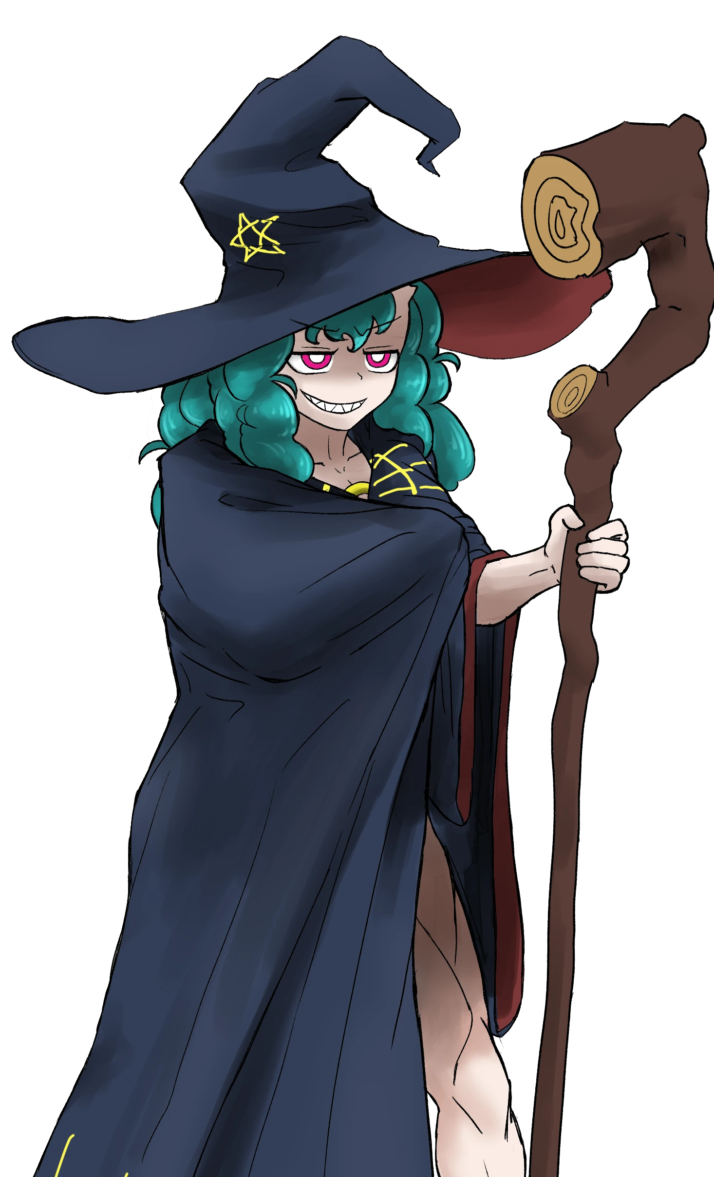 とんがり帽子に大きなケープに身を包み、杖(宿り木の棒杖)を手に持っている。