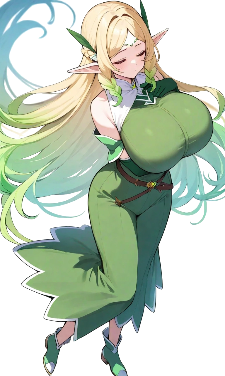 金色から緑へのグラディエーションが美しい長髪、と男性の目を惹きまくるほどのスタイルが特徴的なエルフ。