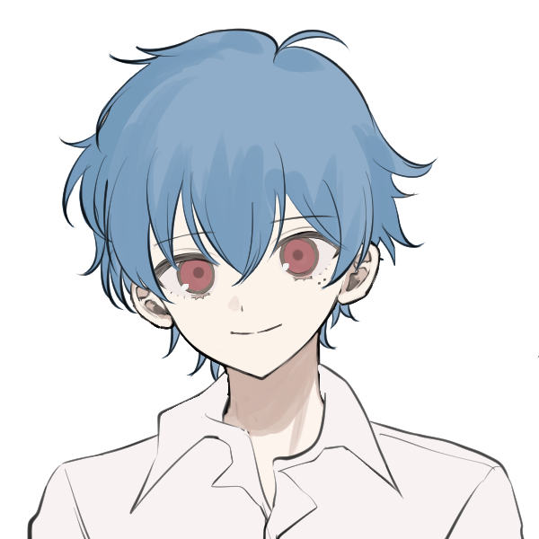 青髪、赤眼。右肩にカンザクラの花が咲いている。