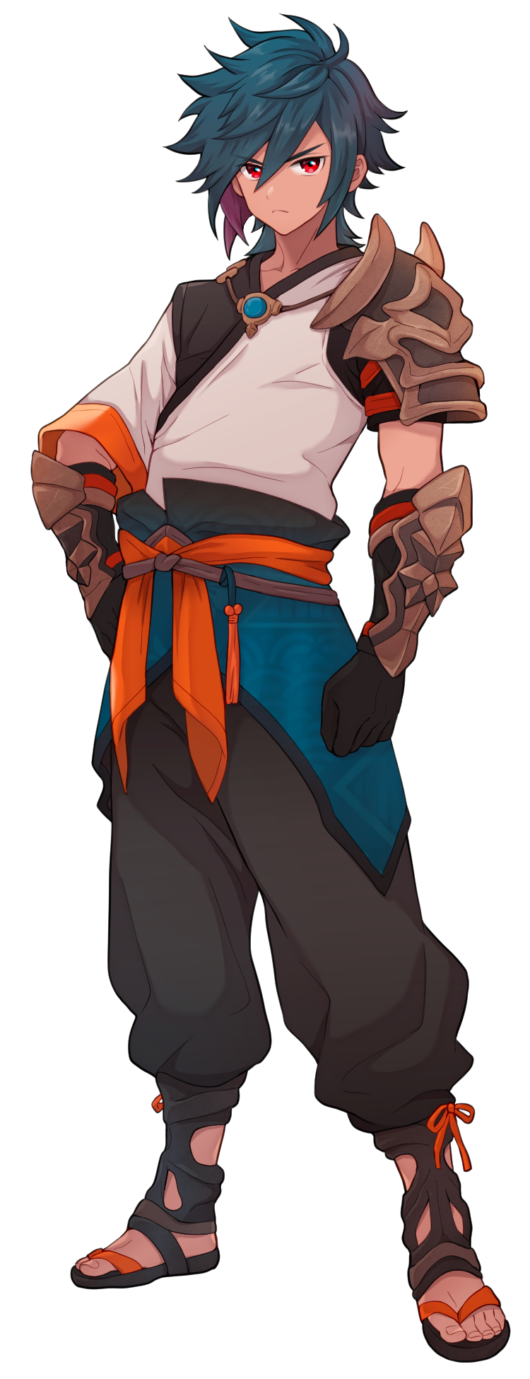特記事項:機甲神アールマータの厳格な信徒であり、青い髪と赤い目、そして特徴的な服を纏う青年である。手は祈ったり人の手を取るためと考えておりグラップラーでは珍しく、足技を得意とする。