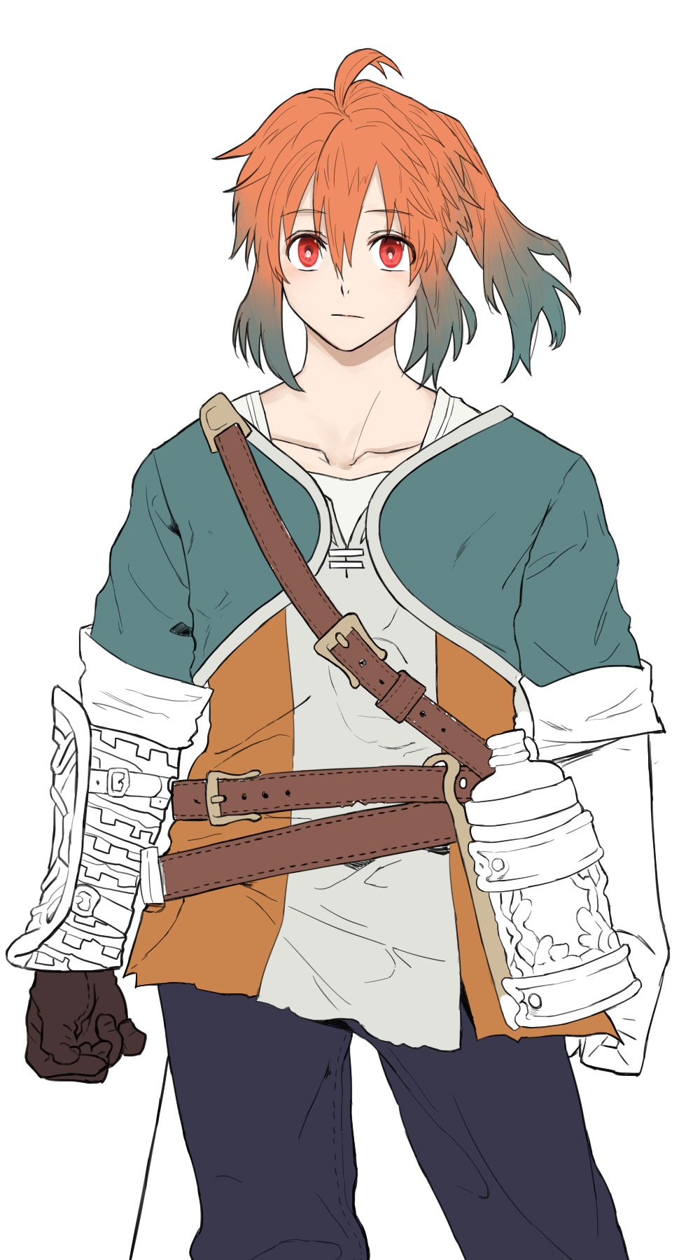 外見:赤橙色の髪と目に、少し長い髪を後ろでまとめてる