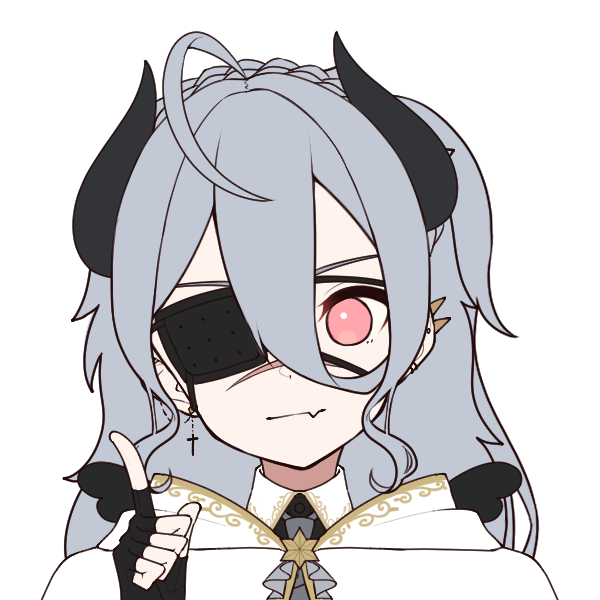 銀色にくすんだ灰のような右目とパールのような桃色の左目、顔に横一線の大きな傷を持ち、頭部に角、背に傷だらけの小さな翼が映えた女性。