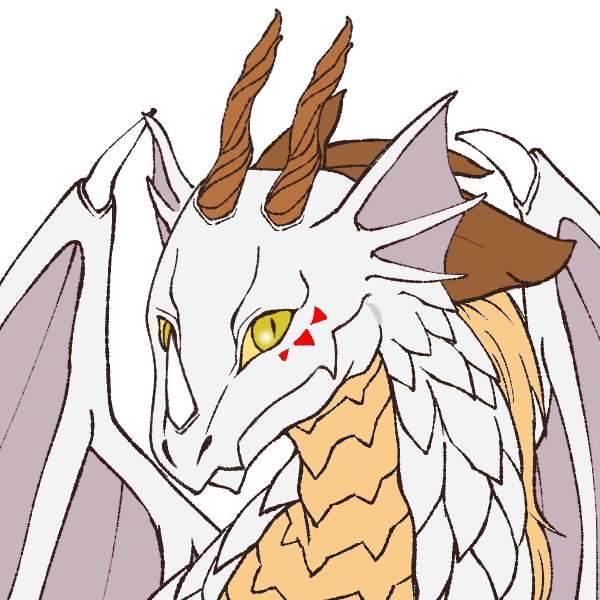 白銀の鱗に金色の目、左目の下に赤い三角が3つ模様が描かれている若いリルドラケン。