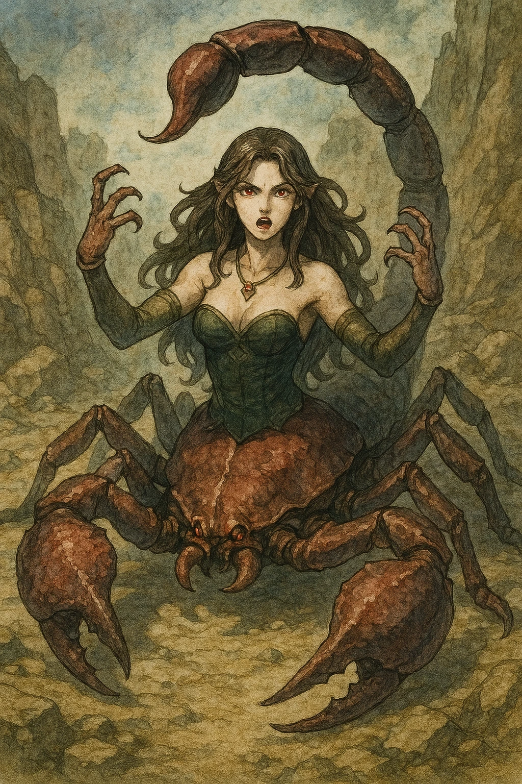 ・黒髪、真紅の瞳、赤銅色の甲殻のシザースコーピオン