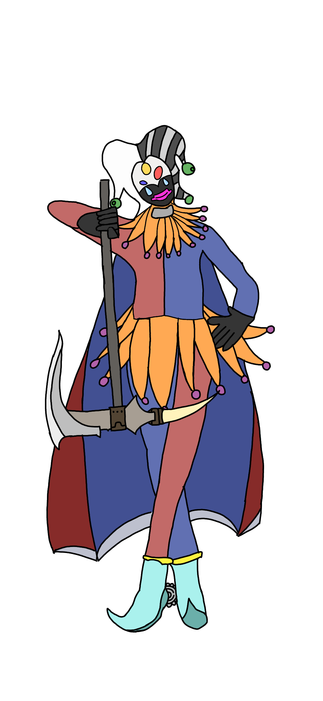 両目の下に雫型の宝石が2つある。本人は道化師っぽい服装なら似合うかなーっと思ってこの姿をしているが初見では引かれることもままある。