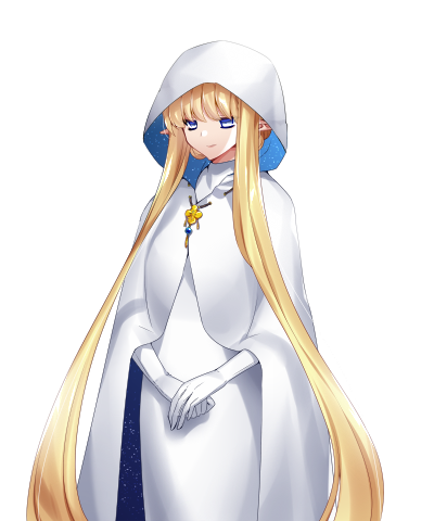 お淑やかで物静かなスノウエルフの女性。内側に星空を模った裏地を縫い付けた真っ白な服を見に纏っている。普段は物腰柔らかでどんな人にも手を差し伸べる優しい人だが、悪辣な相手や悪事を働く者、敵と認識した者や奈落には躊躇なく棒杖を構える強さも持つ。