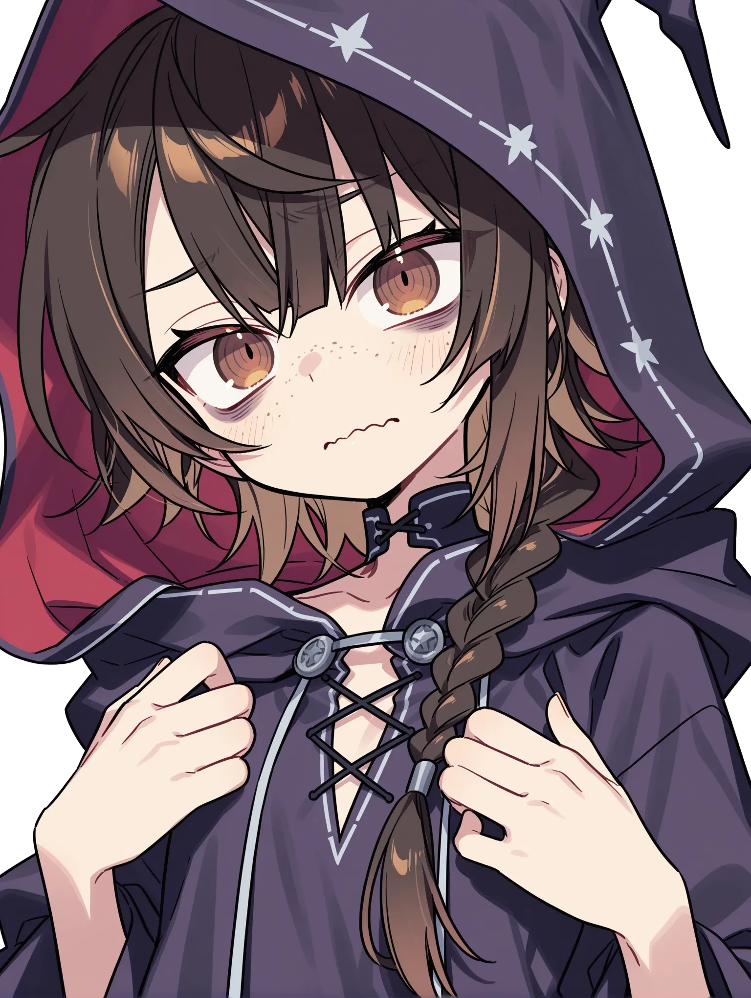 戦いがそれほど好きではなく、バーバヤガーという種族が往々にして有する「孤独を好み排他的である」性質がよりネガティブな方向に発現しており、極度の人見知りであるため断るのも一苦労だったのだが、度重なるスカウトに加え、10歳まで母親からスパルタ気味に魔法の教育を受けていた事という事情も重なり、すっかり対人恐怖症かつ吃音気味になってしまった。そしてもう耐えきれないと思ったある日遂に逃げ出し、逃げ出し、ドレイクが現れない場所を追い求めた結果、最終的に人族の街に身を寄せる事にした。