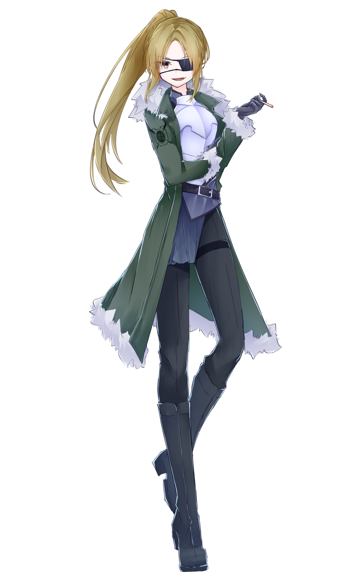- 鎧の上にフード付きのコートを身に纏い、手袋を装着している。これは弱点が水氷で寒がりの為。またコートの左腕には信仰であるガラクシアの聖印を模した刺繍がされており、ネックレス化した聖印とは違う意味で目立っている。自身は女性らしさは微塵もないと思っているため、スカートなど可愛らしい格好は持っていない。