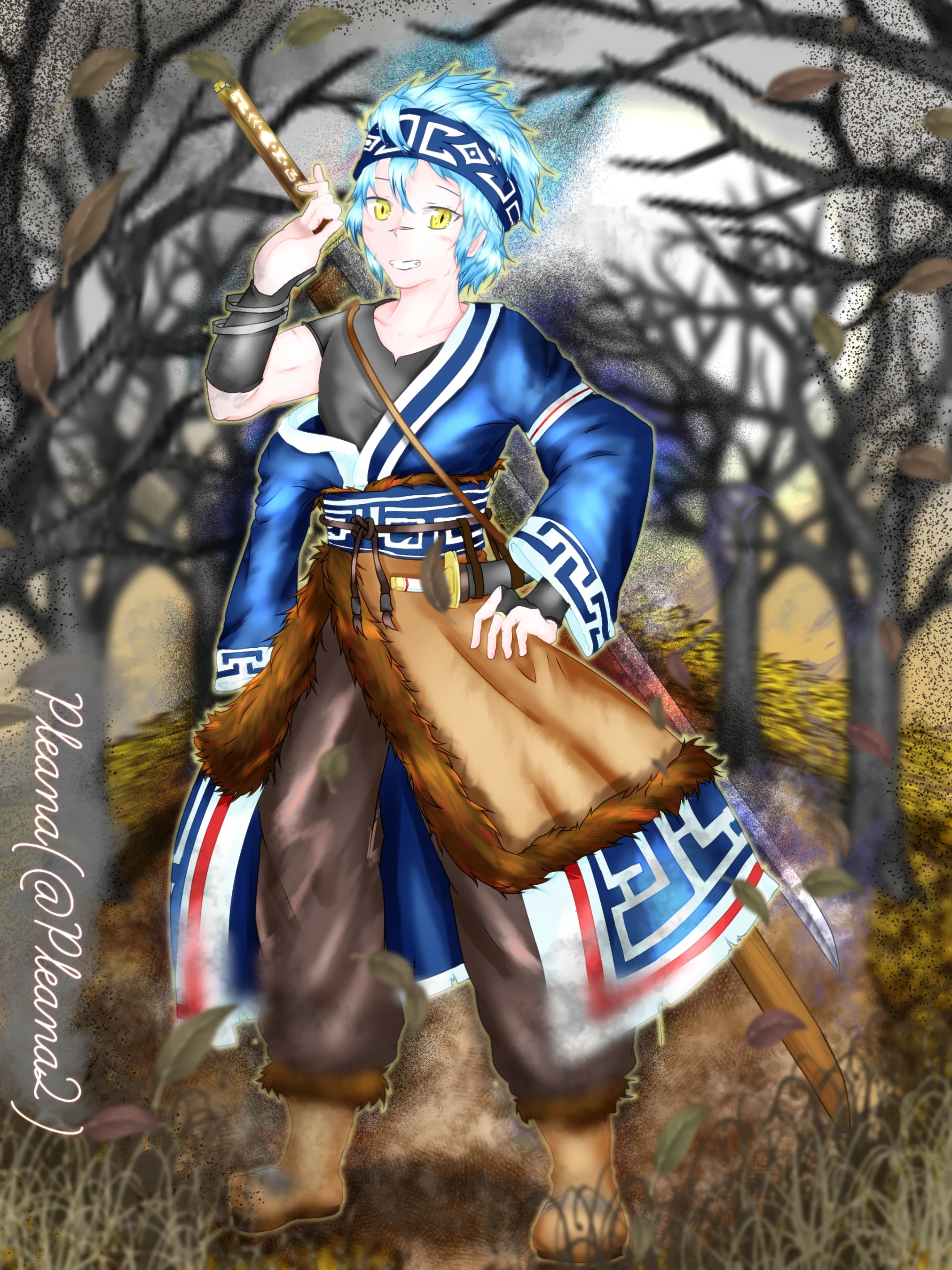 明るい青い髪に金色の目が特徴の青年