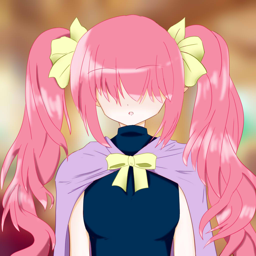 - ふわふわのピンク髪、青い瞳。