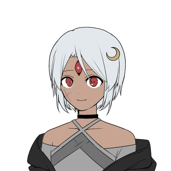 顔には幼い頃に反融和組織に襲われた時にできた傷があり、頭には月神シーンの聖印を象った髪飾りを付けている。