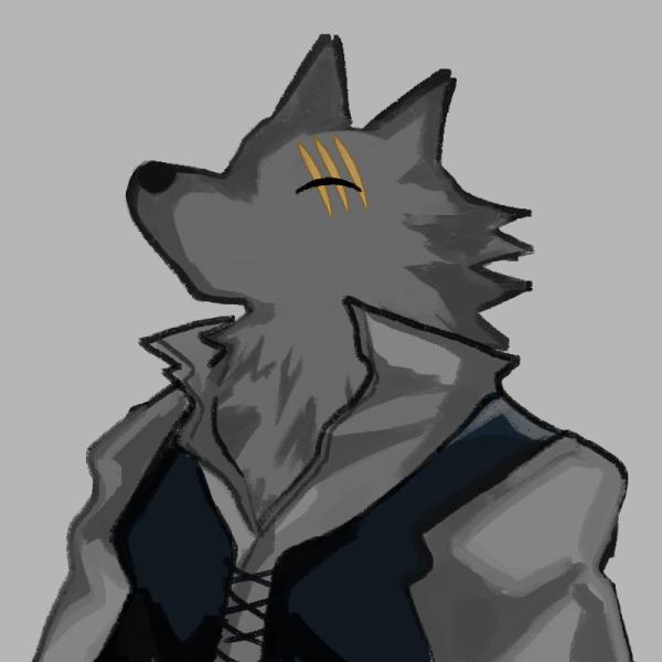 オオカミの獣人。灰色の毛並み。糸目。