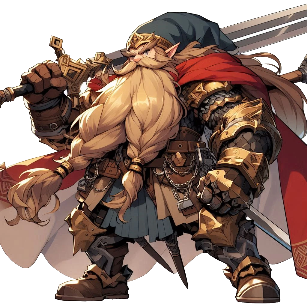 性格はドワーフらしく豪放磊落で、大雑把ながらも誰かを守ることを第一に考える。敬語は苦手で言葉遣いは粗野だが、仲間への思いやりにあふれている。彼の信条は「弱きを守り、強きをくじく」こと。ただし、その「強さ」の基準は筋肉量で測られることが多い。特にエルフとの相性が悪く、「ひょろい」という理由で守られるべき対象と見なし、「前に出るな」と命じることも。無意識ながら見下している部分もあり、エルフからはしばしば反感を買う。しかし、彼自身に悪意はなく、自分なりの正義感に従って行動している。