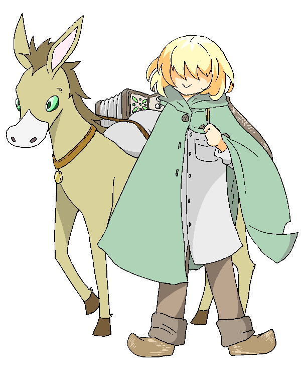 ザハブ:800Gで購入したロバ。意味は黄金。他のロバより体が小さめで色も薄かったことから売れ残っていたのをたまたま買い取った。ポレポレは自身の髪色と似ているなぁぐらいしか思っていない。大きさもあんまり大きければ荷物を載せられないので丁度いいと思っている。ザハブはザハブでおいしい草をくれるのでうれしい。戦闘時は器用に楽器を置いてさっさと逃げる、終わったら帰ってくる。
