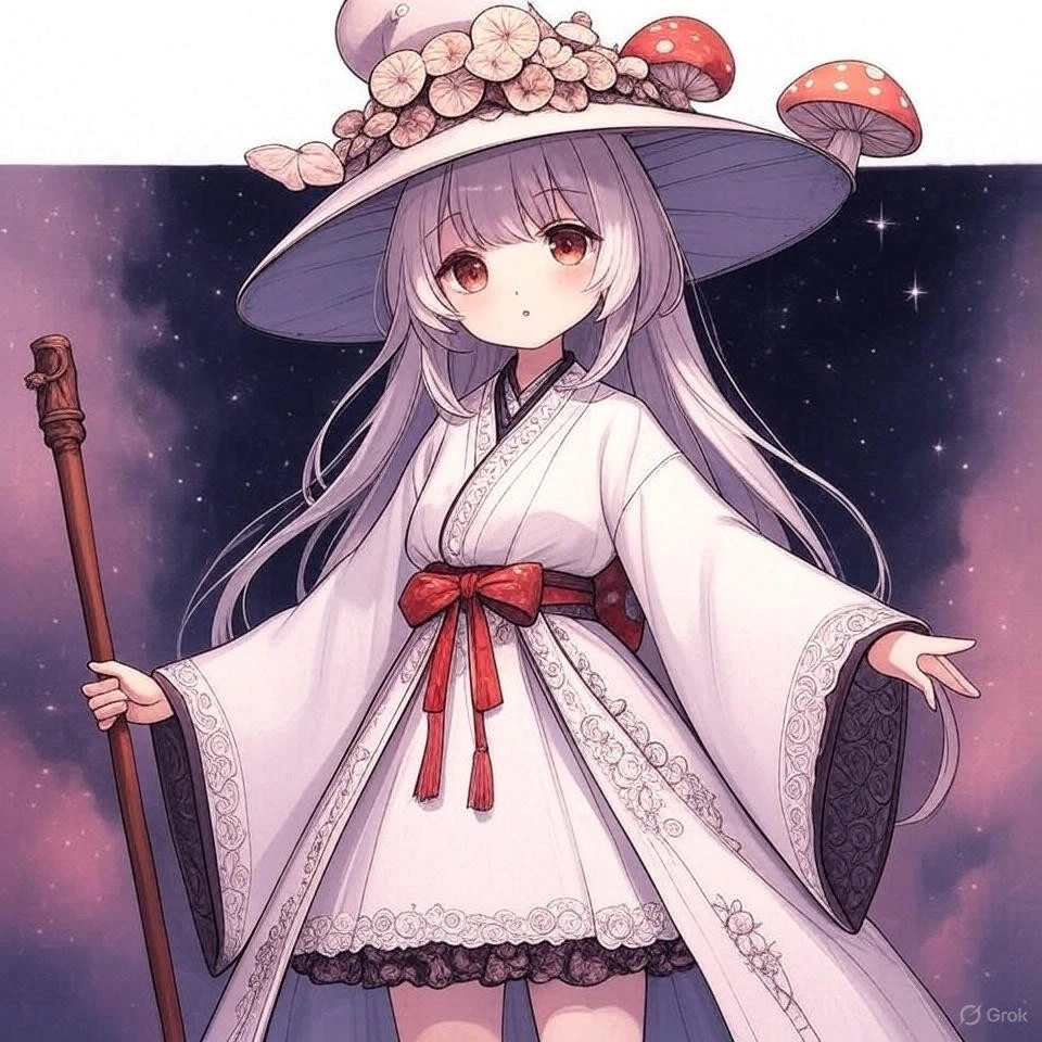 148cm程度、体重かるい 頭にはキノコの傘のような銀色の髪と赤い瞳。