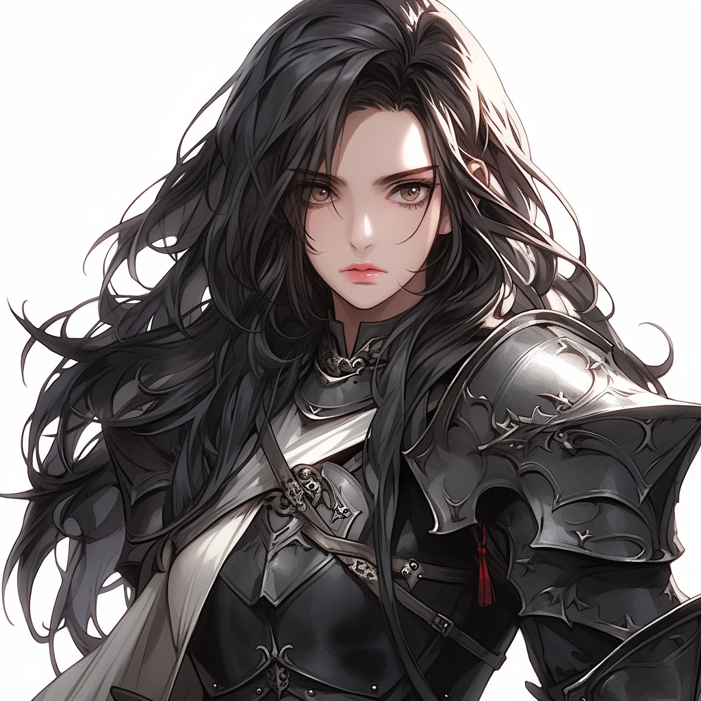 黒髪ロング。白い肌。金属鎧、革鎧、カイトシールド、ロングソード。ファンタジー。騎士。