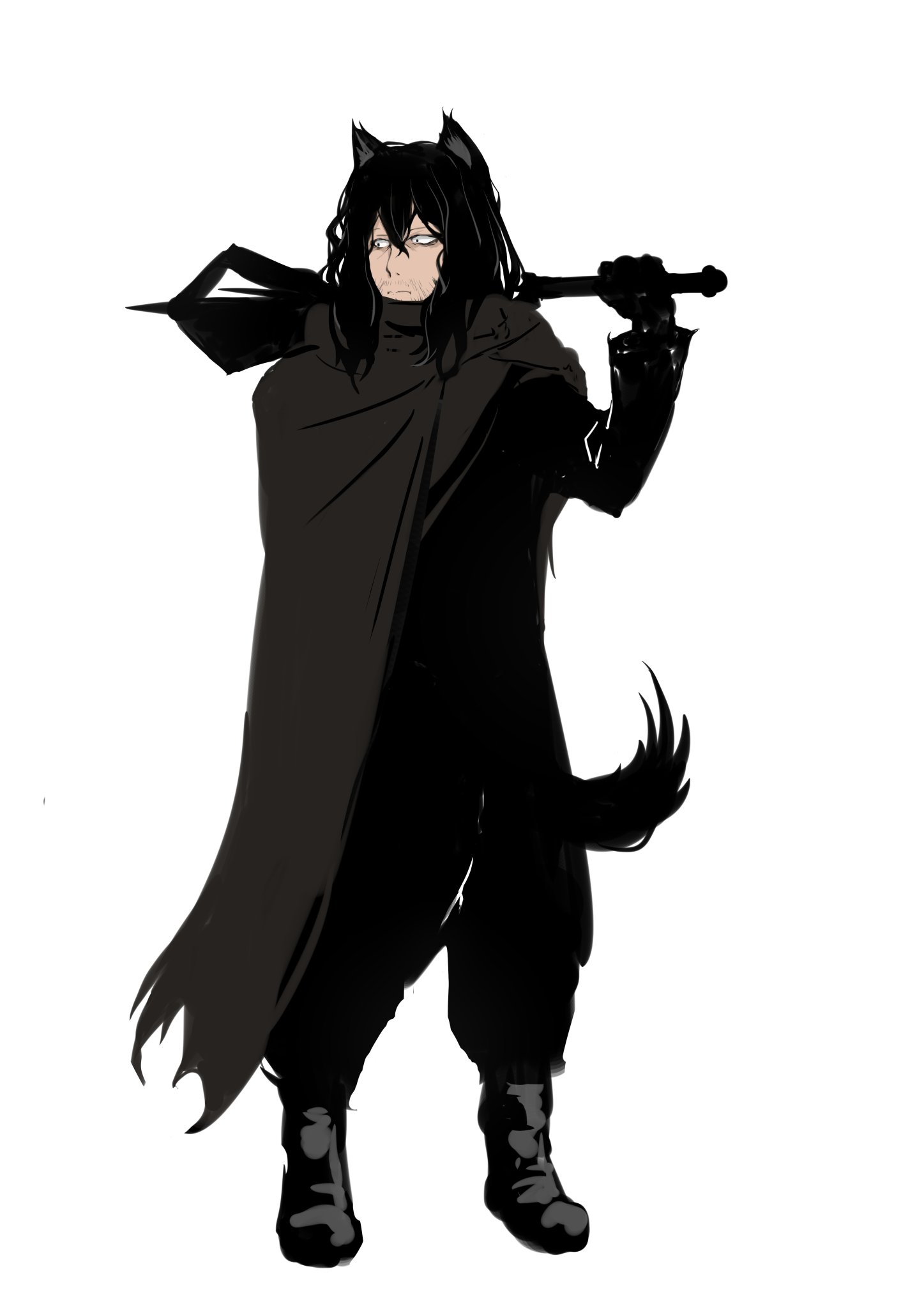 黒髪黒目、黒い毛に覆われた犬耳とふさふさの尻尾。くせ毛でやや目付きが悪く、老け顔。獣変貌すると黒柴頭と化す。