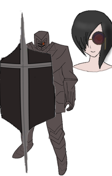 魔眼側にモノクルサングラスをつける事で両目を使えるようにしているが兜からうっすらオレンジに光って見えその巨漢に威圧感を出している。