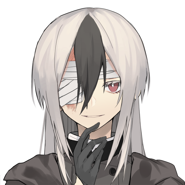 スラっとした細身の人族の男。綺麗な白髪が毛先に近づくにつれ黒に移り変わってくグラデーションが美しい。古傷を隠すために包帯を巻いており、その上で大きめのケープを羽織っている。穢れがなく基本的に差別的な扱いを受けているが、基本的に温厚で静かに何も言わない。戦闘以外ではやさしい一面を見せるが、その心の底には何か毒々しいものを秘めている。