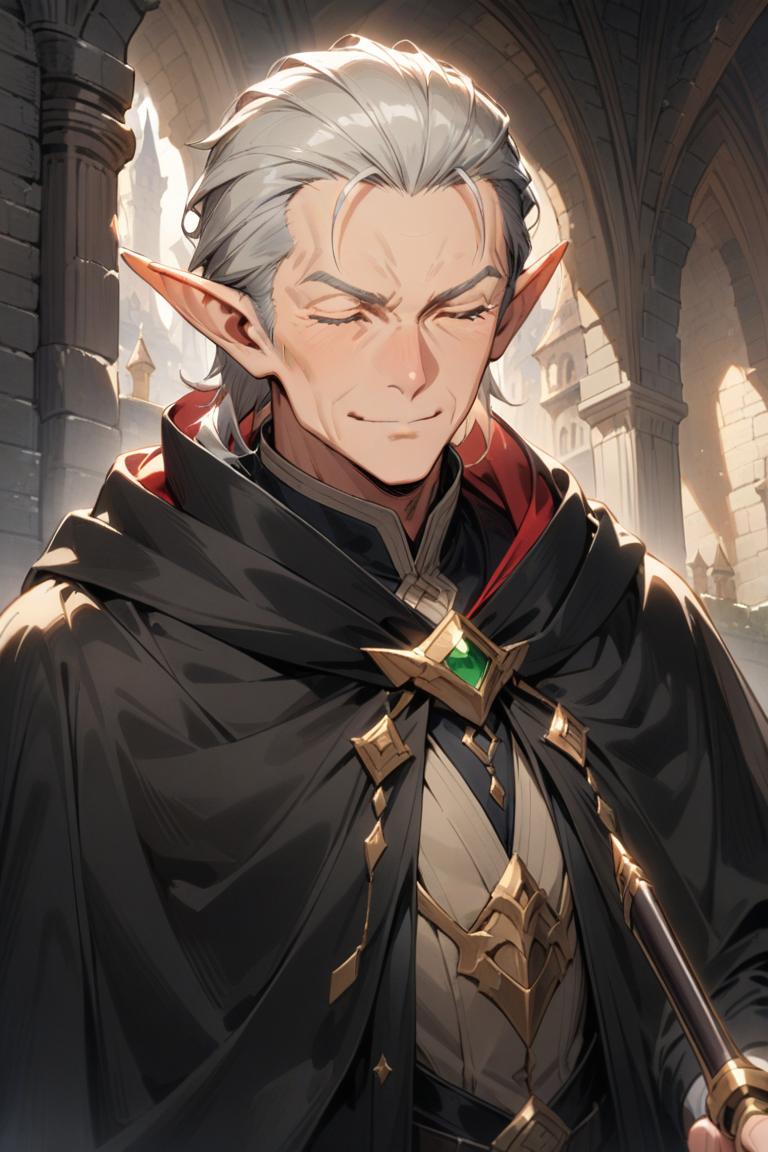 穏やかな笑みを浮かべた紳士的な振る舞いのエルフの老人です。服装は軍服を身に纏い、特注の〈ドミネイターズマント〉を羽織っています。