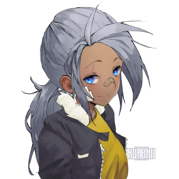 髪の色:灰色 瞳の色:青色 肌の色:焦げ茶色