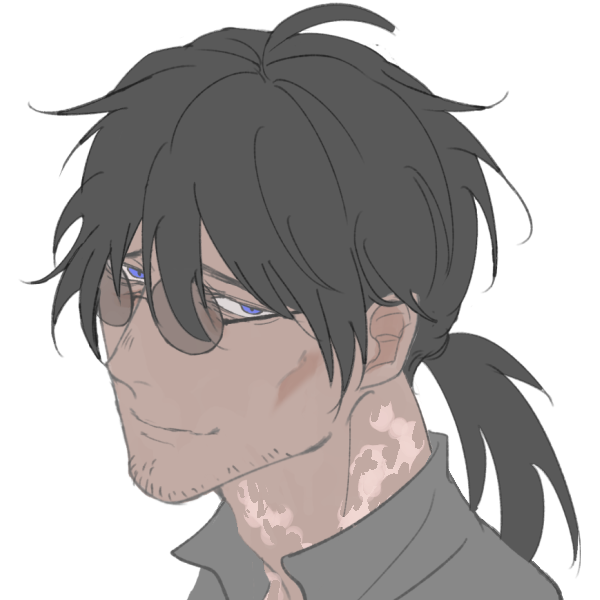 青鈍の、ぼさぼさクセ有り長髪をうなじで束ねてある。瞳はよく見ると美しい瑠璃色。顎周りに不精髭。ちゃんと剃ればそれなりに整った顔立ち、のはず。