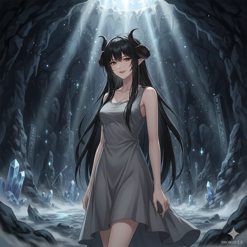 夜の漆黒のような黒髪にナイトメアの角を持ち、灰色のサマードレスを身に着けている。育ちの良い少年のような言葉遣いで話すが、愛嬌もありどこかいたずらっぽい。