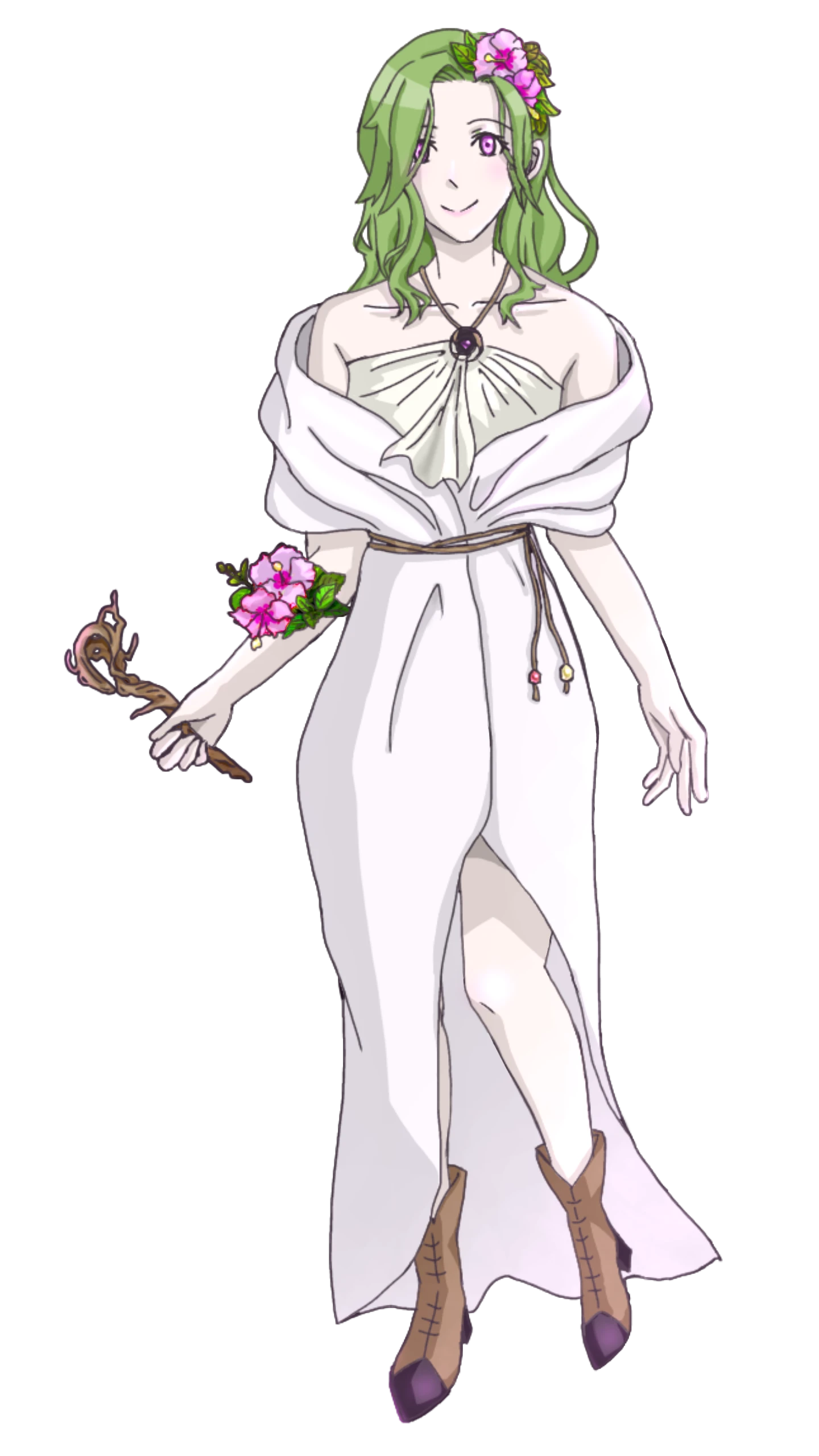 頭や腕に薄紫色の花をいくつか咲かせている。