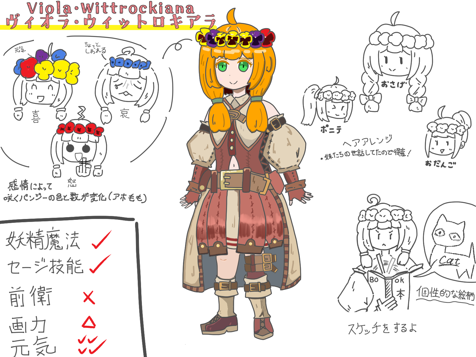 メリアにしては小柄な体格で、緑髪の頭に彼女を象徴するパンジーの花を冠のように付けている。
