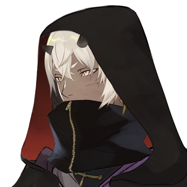 猫のような鋭い金目と白髪、黒い角持ち。幼少、その容姿でからかわれたことがあるため、フードを被っていた。