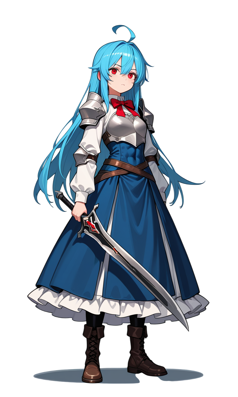 服:white blouse,red bowtie,blue long dress,frilled dress,breast armor,