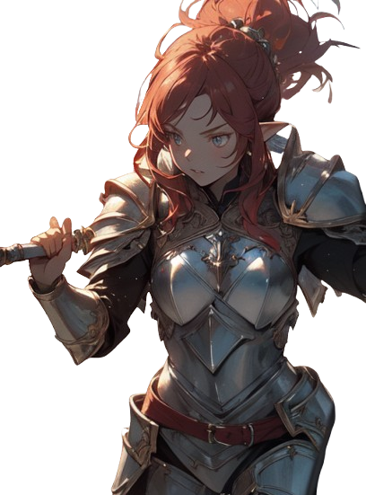 燃えるような赤い髪のエルフ。無骨な金属鎧と3メートルの長さのウォーハンマーを担いでいる。