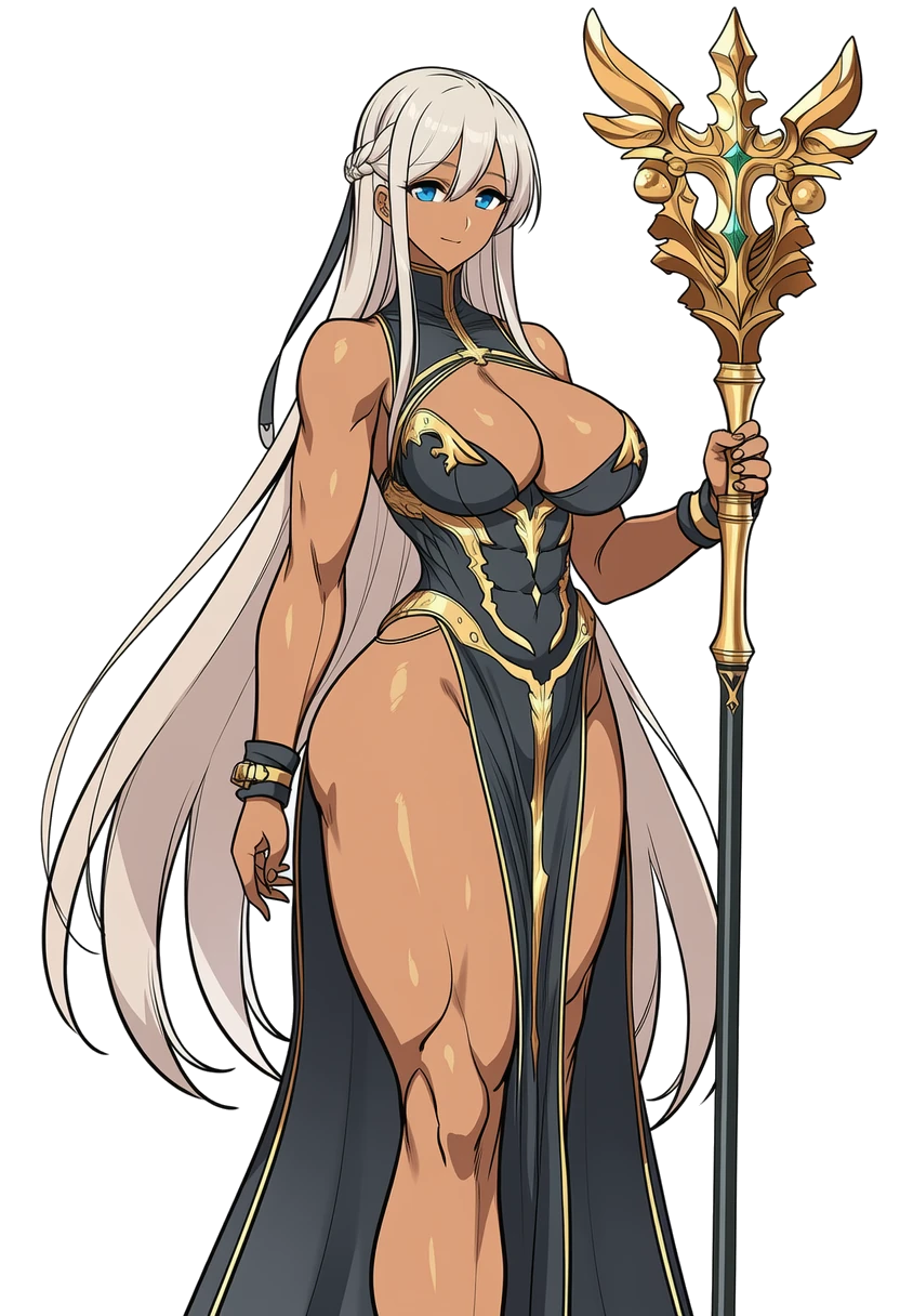 180cm以上ある長身で膝くらいの長さもある銀色の長髪も特徴的。更には胸もお尻も大きいとあって目を引くスタイルである。