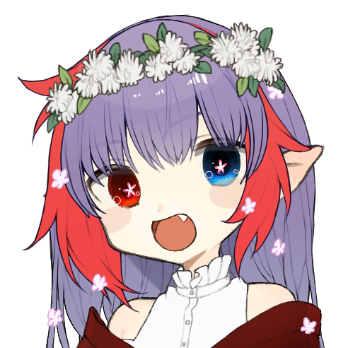 髪は赤紫色、目はオオッドアイズです、契約で召喚された妖精に合わせて目の色が変わる、花が髪に咲く