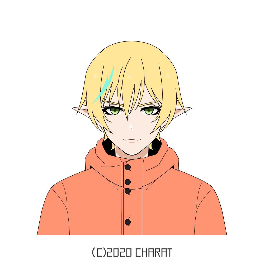 髪型は金色の髪を雑に短くしたような感じで、目の色は緑。