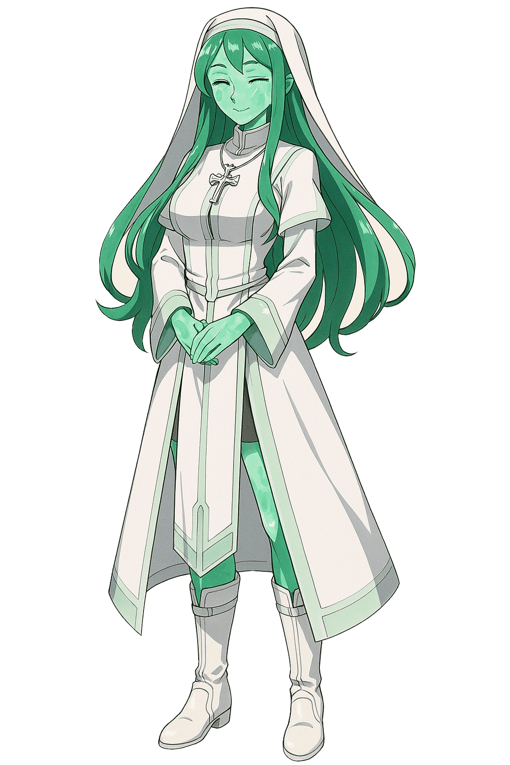 高身長で体がエメラルドでできているフロウライト。服装としては白っぽいシスター服ではあるものの、ライダーであるため動きやすい機動力の高い服を着ている。