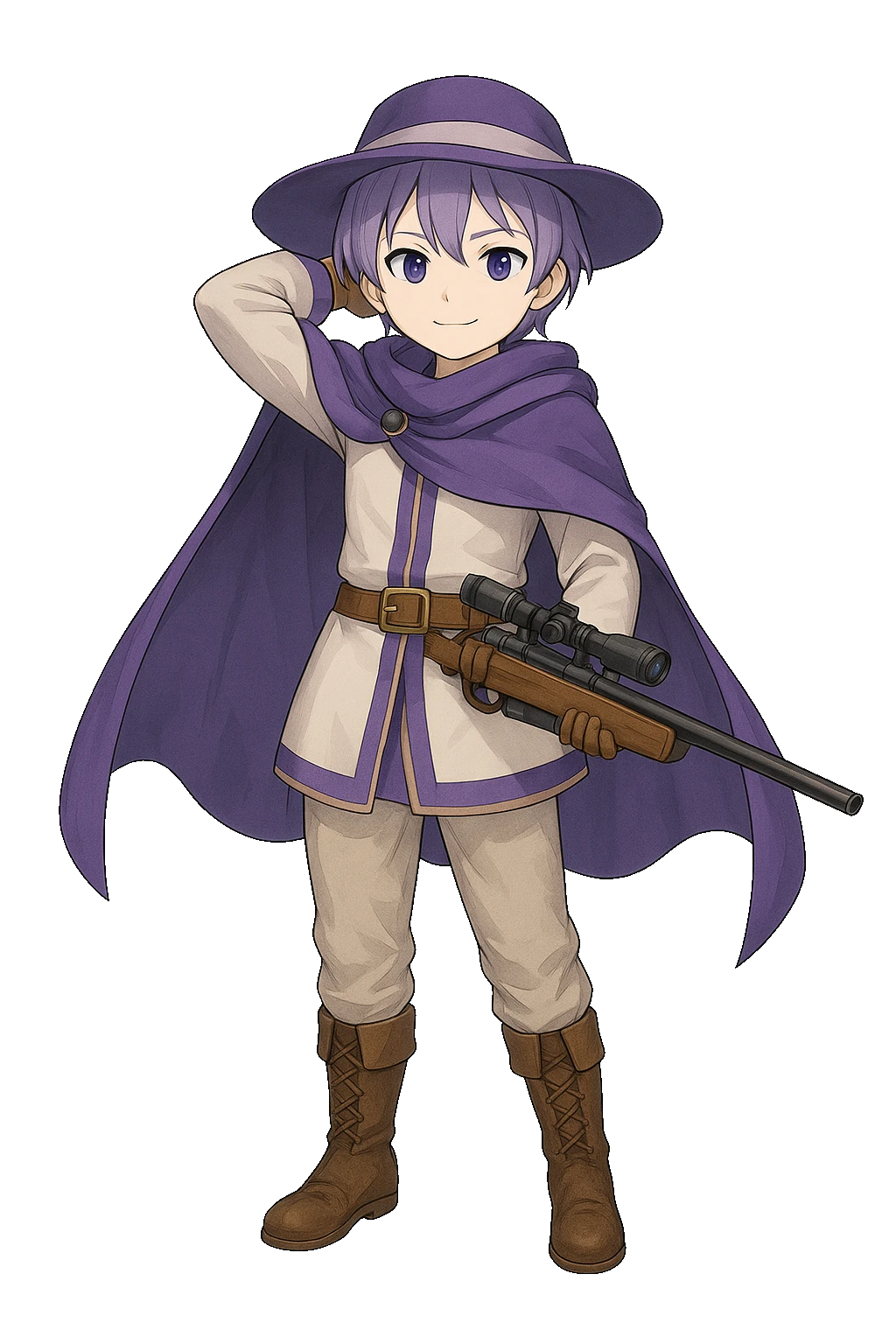 上半身は軽快な革製の胸当てとマントに覆われ、腰にはロングバレルとバレットポーチ、腰の両脇に2丁のブラッドリボルバー。衣服は実用性を重視しながらも、細部に金属の装飾が施され、彼がただの狩人ではなく“戦場の射手”であることを印象づける。