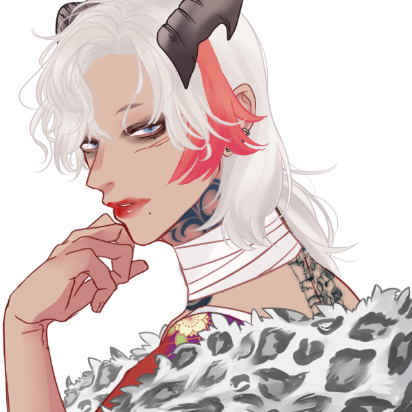 浅黒い肌に、赤のメッシュが入った白髪、そこから生えた1対の角が特徴的。体には刺青が刻まれている。彼の家族らとは全く似ていない。