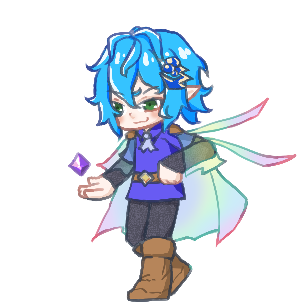 艶のある水色の髪や身体中に宝石飾りを身に着けた、エルフの男性。どんな時も口数が減らない。