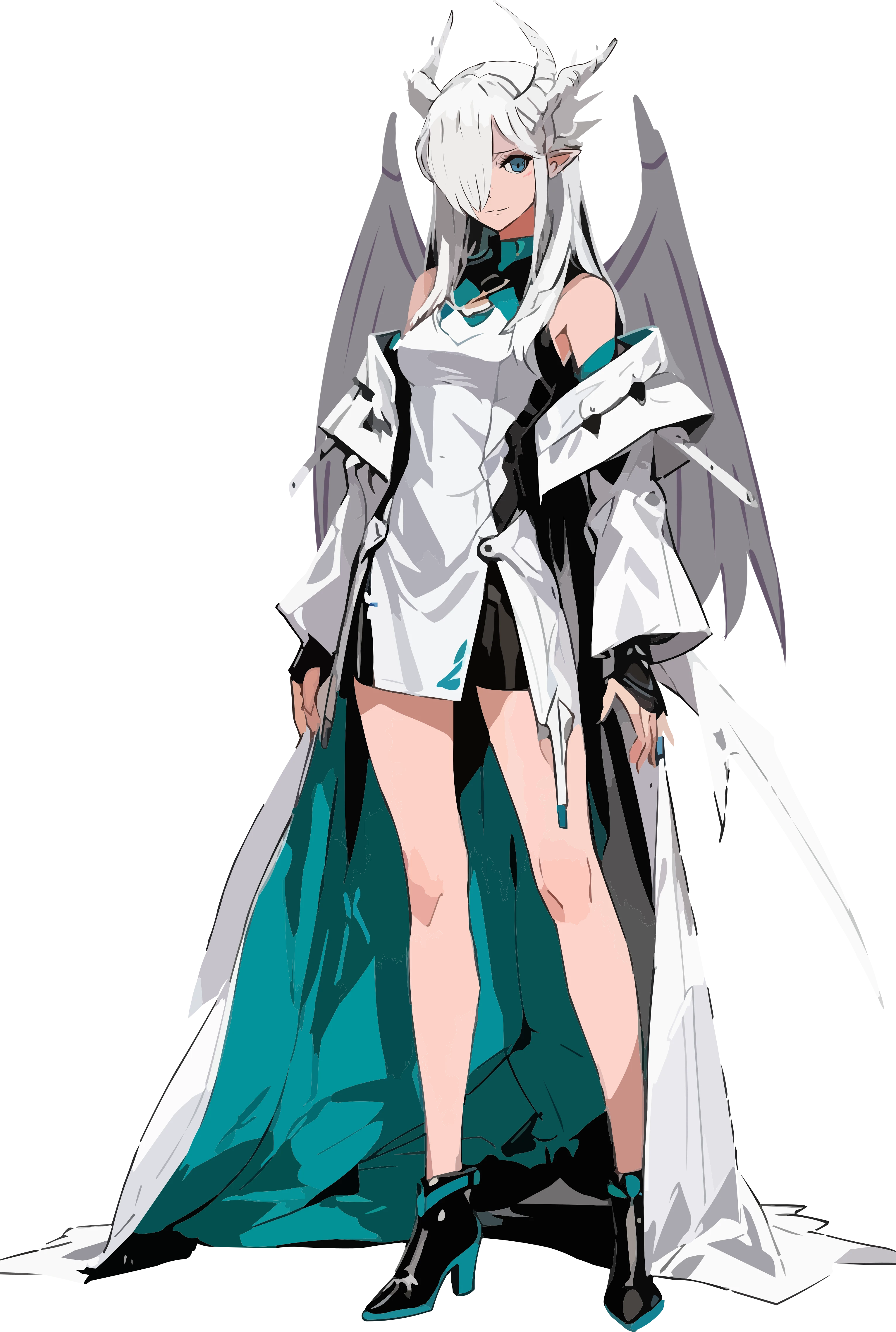 冬を思わせる寒色系のロングヘアーをし、切れ長の冷たい瞳が特徴的なドレイクの女。陶磁器のような白い肌と頭から生えたドレイクの角が目を引く。