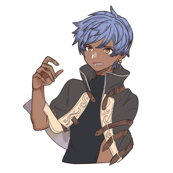 褐色の肌、中背中肉、青い髪、